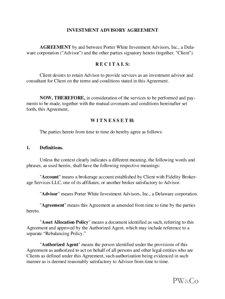 INVESTMENT ADVISORY AGREEMENTAGREEMENT by and between Porter White Investment Advisors, Inc., a Delaware corporation (\” Advisor\”) and the other parties signatory hereto (together, \” Client\”).