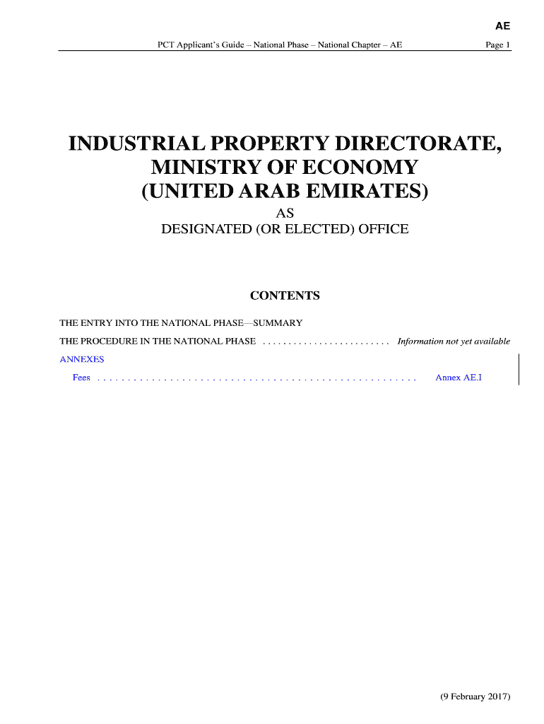 AE PCT Applicants Guide National Phase National Chapter AE Page 1INDUSTRIAL PROPERTY DIRECTORATE, MINISTRY OF ECONOMY (UNITED ARAB EMIRATES) AS DESIGNATED (OR ELECTED) OFFICECONTENTS THE ENTRY INTO
