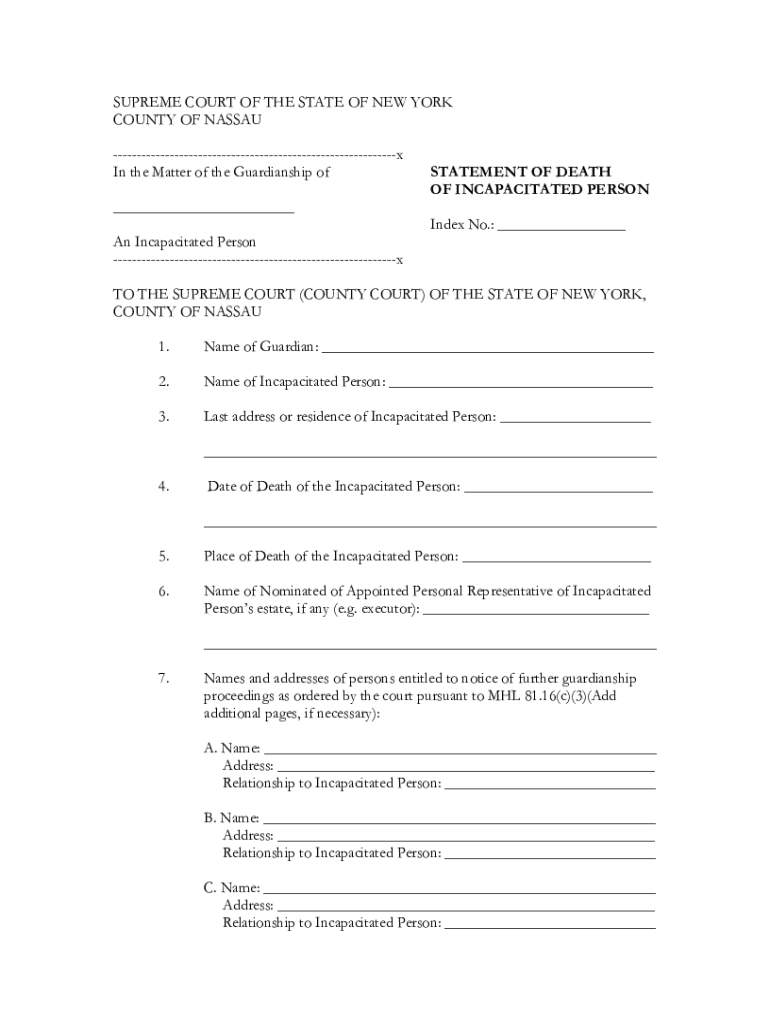 SUPREME COURT OF THE STATE OF NEW YORK COUNTY OF NASSAU x In the Matter of the Guardianship of ___ An Incapacitated Person statement OF DEATH OF INCAPACITATED PERSON Index No.: ___TO THE SUPREME COURT
