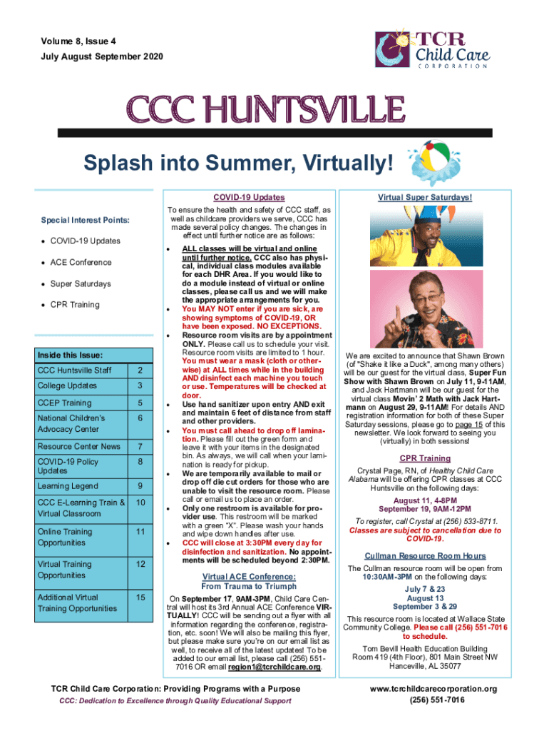 PAGE 1Volume 8, Issue 4 July August September 2020CCC HUNTSVILLE Splash into Summer, Virtually! COVID-19 UpdatesVirtual Super Saturdays! To ensure the health and safety of CCC staff, as well as childcare