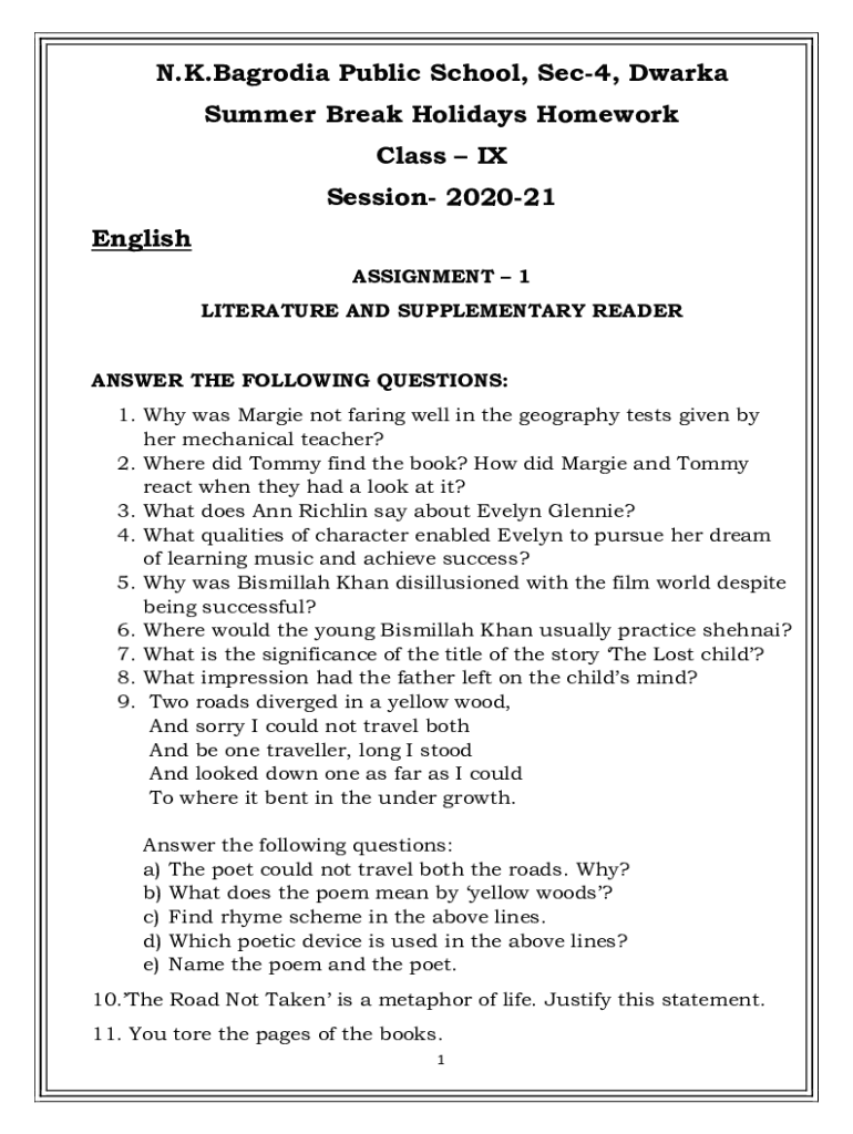 N.K. Baroda Public School, Sec4, Dark Summer Break Holidays Homework Class IX Session 202021 English ASSIGNMENT 1 LITERATURE AND SUPPLEMENTARY READERANSWER THE FOLLOWING QUESTIONS: 1. Why was Margie