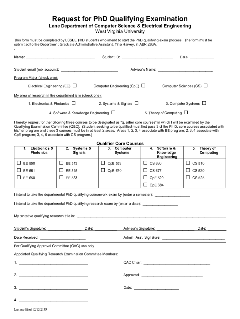 Request for PhD Qualifying Examination Lane Department of Computer Science & Electrical Engineering West Virginia University This form must be completed by LCS EE PhD students who intend to start