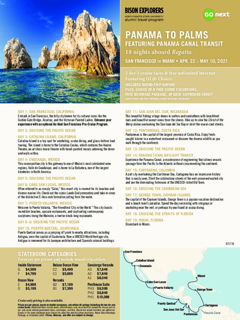 PANAMA TO PALMSFEATURING PANAMA CANAL TRANSIT 18 nights aboard Regatta SAN FRANCISCO TO MIAMI APR. 22 MAY 10, 2021 2for1 cruise fares & free unlimited internet Featuring Life Choice: INCLUDES ROUND