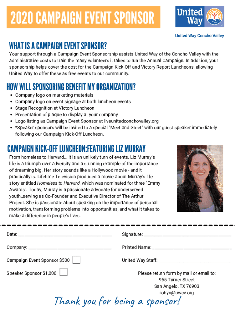 2020 CAMPAIGN EVENT SPONSORSHIP IS A CAMPAIGN EVENT SPONSOR? Your support through a Campaign Event Sponsorship assists United Way of the Conch Valley with the administrative costs to train the many