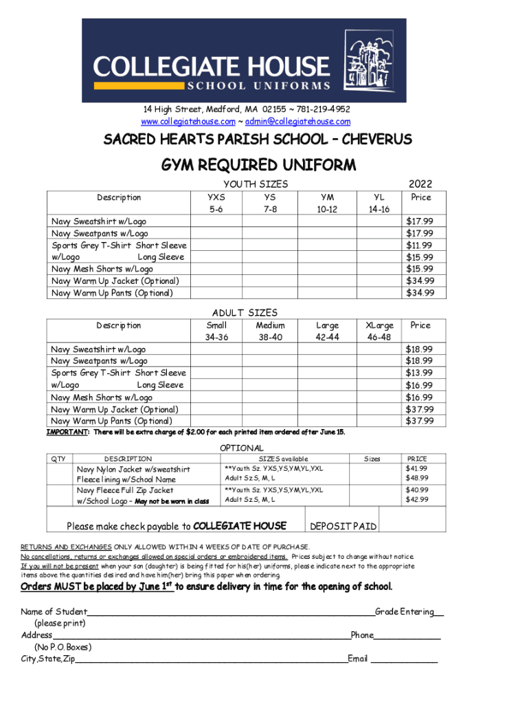 14 High Street, Medford, MA 02155 7812194952 www.collegiatehouse.com admin@collegiatehouse.comSACRED HEARTS PARISH SCHOOL CHEVERUSGYM REQUIRED UNIFORM 2022YOUTH SIZES Descriptions 56YS 78YM 1012YL