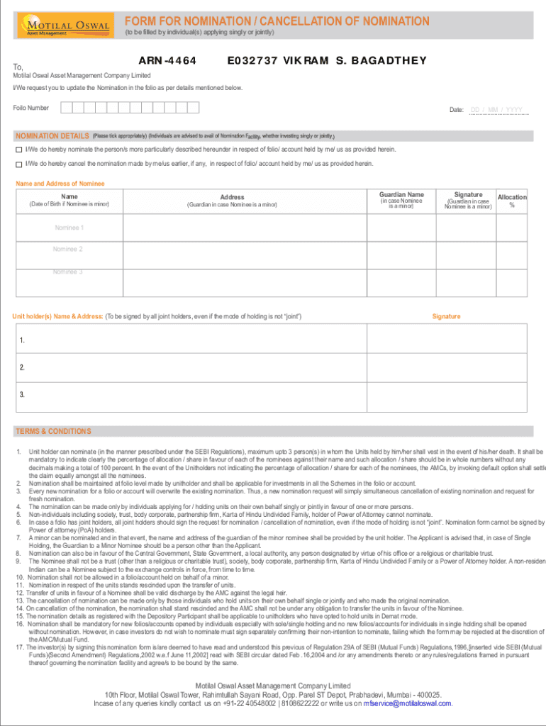 FORM FOR NOMINATION / CANCELLATION OF NOMINATION (to be led by individual(s) applying singly or jointly)ARN 4464To,E032737 VIRAL S. BAGADTHEYMotilal Oswald Asset Management Company Limited I/We request