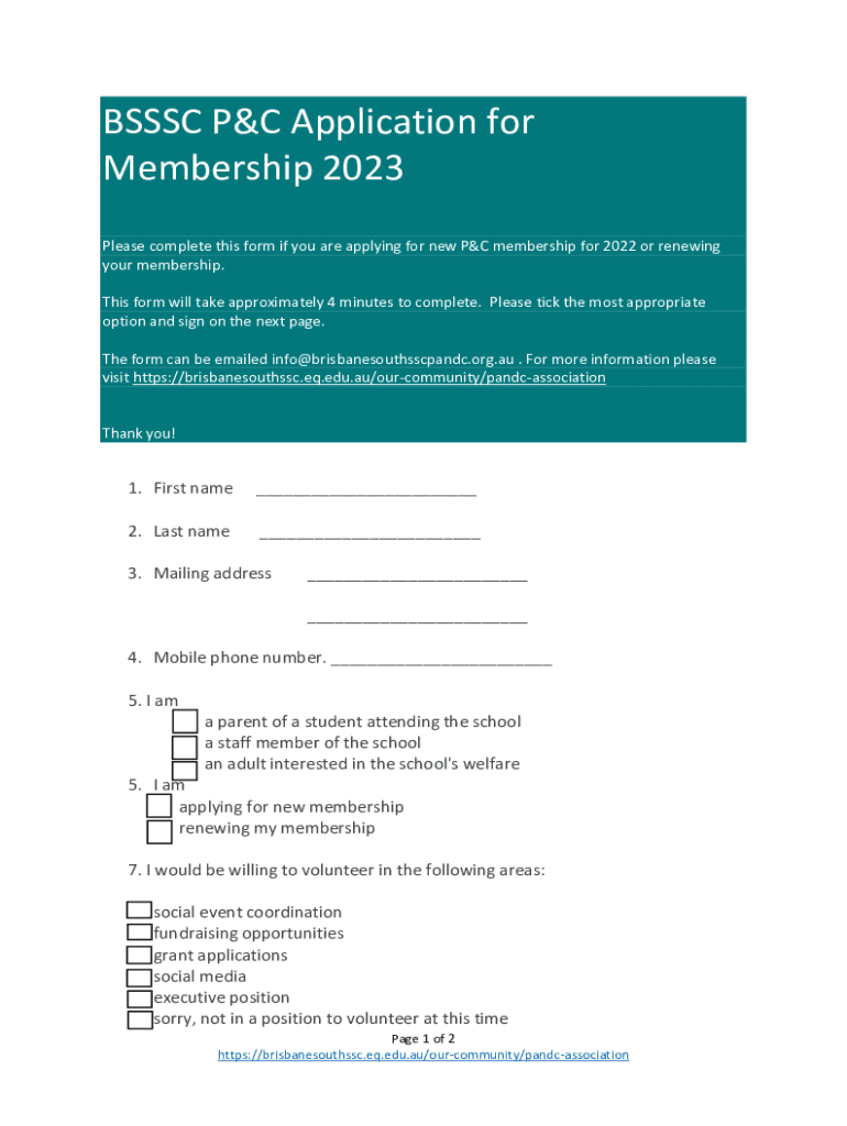 BSS SC P&C Application for Membership 2023 Please complete this form if you are applying for new P&C membership for 2022 or renewing your membership. This form will take approximately 4 minutes to