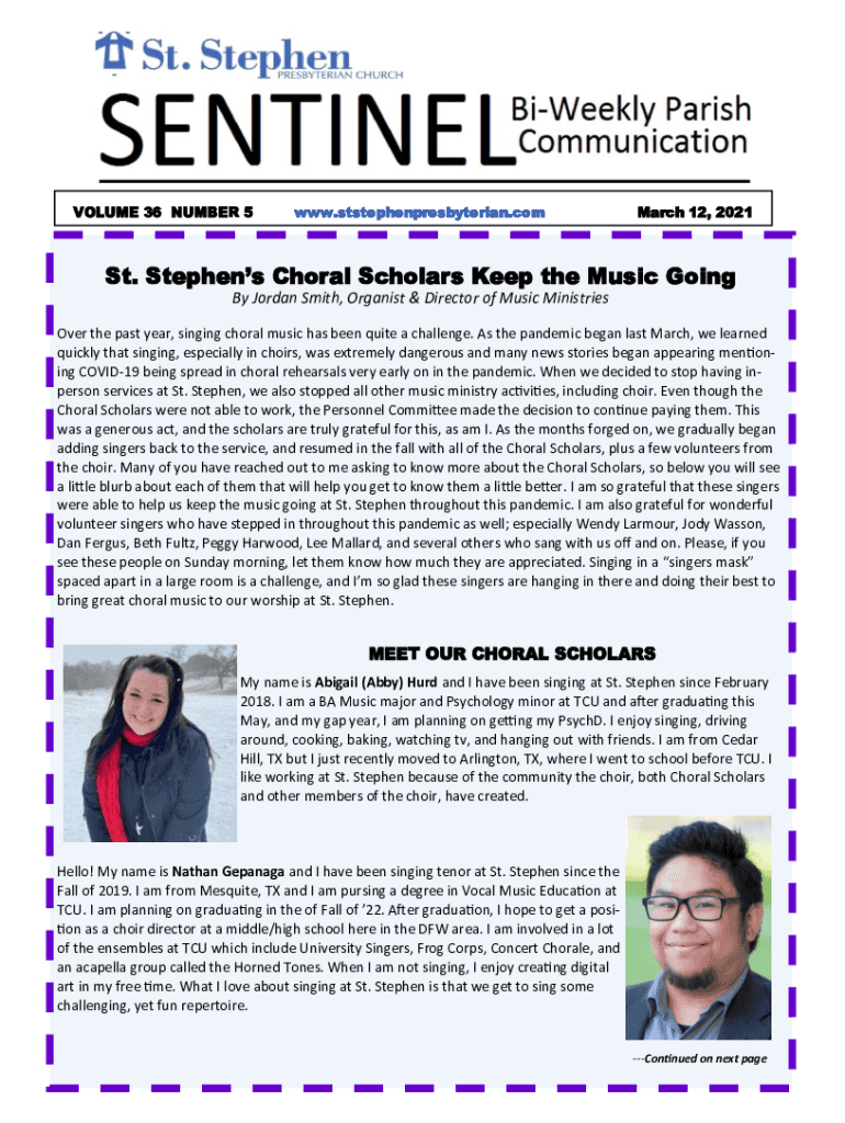 Think. Serve. Worship. Belong. VOLUME 36 NUMBER 5www.ststephenpresbyterian.com March 12, 2021St. Stephens Choral Scholars Keep the Music Going By Jordan Smith, Organist & Director of Music Ministries