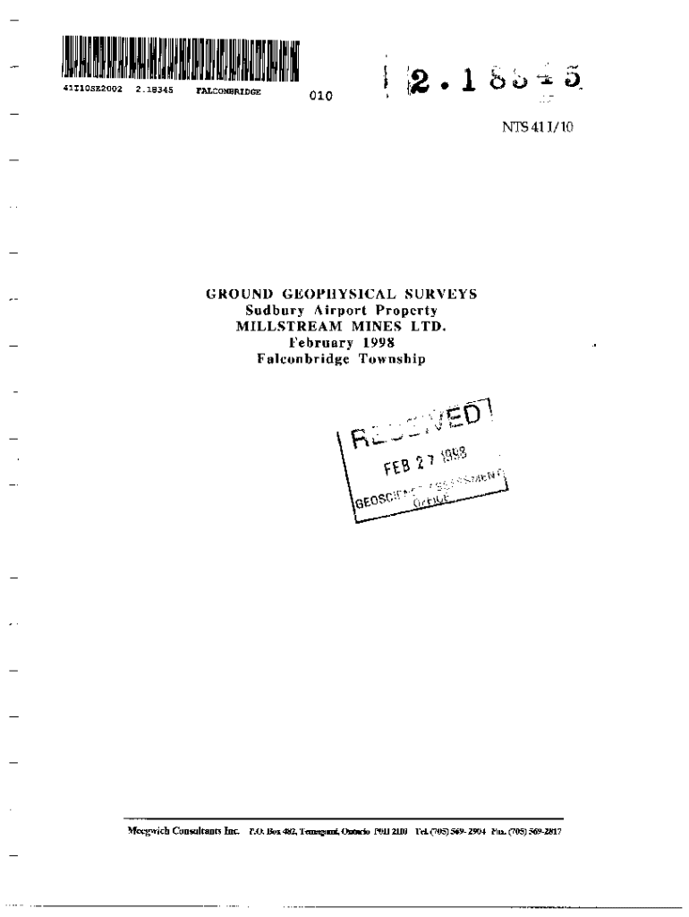 41I10SE20022.18345FALCONBRIDGE010. L S b × .5. NTS 411/10GROUND GEOPHYSICAL SURVEYS Sudbury Airport Property MILLSTREAM MINES LTD. February 1998 Falcon bridge TownshipMeegwidl Consultants Inc. P.O.