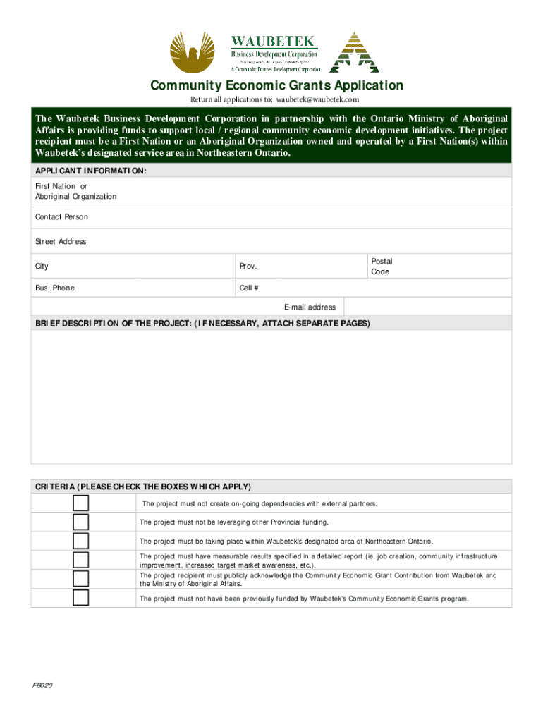 Community Economic Grants Application Return all applications to: waubetek@waubetek.comThe Hauberk Business Development Corporation in partnership with the Ontario Ministry of Aboriginal Affairs is