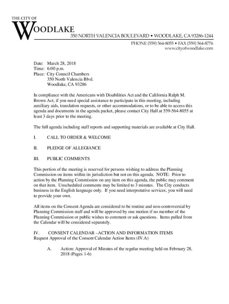 Date: March 28, 2018, Time: 6:00 p.m. Place: City Council Chambers 350 North Valencia Blvd. Wood lake, CA 93286 In compliance with the Americans with Disabilities Act and the California Ralph M. Brown