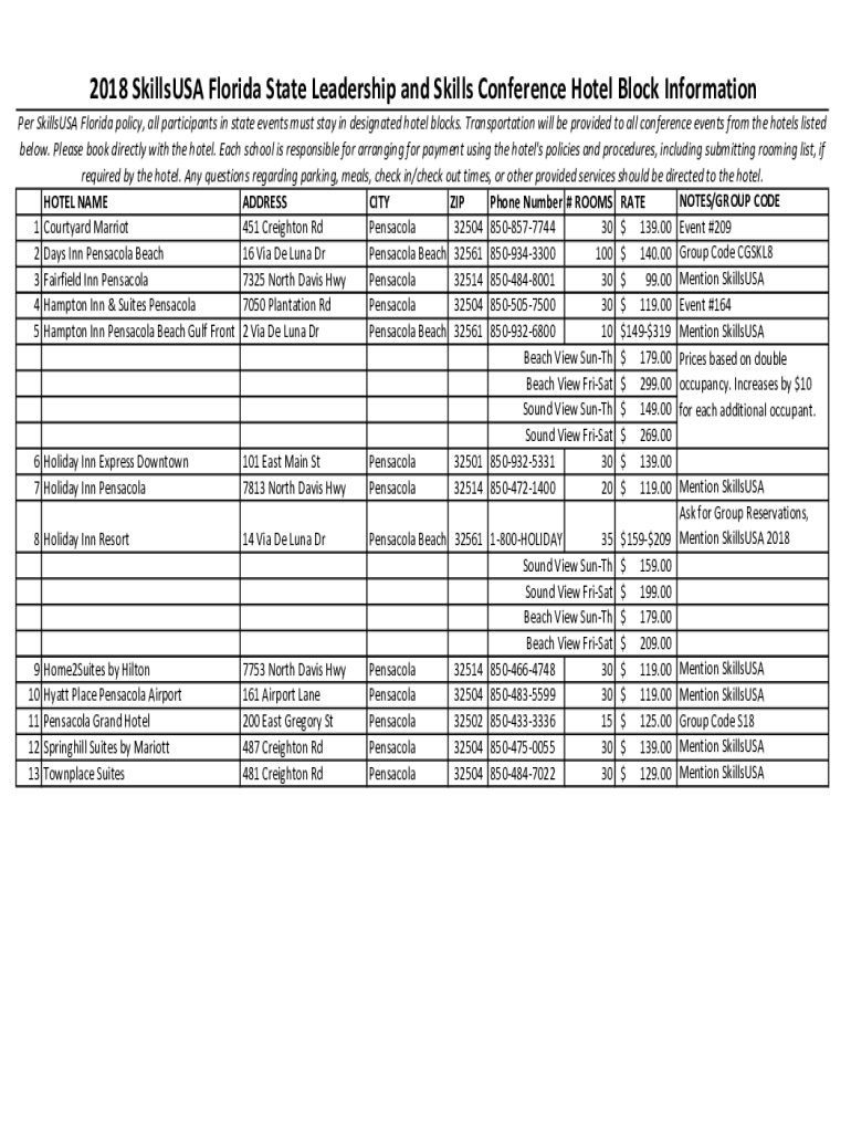 2018 Skills USA Florida State Leadership and Skills Conference Hotel Block Information Per Skills USA Florida policy, all participants in state events must stay in designated hotel blocks. Transportation