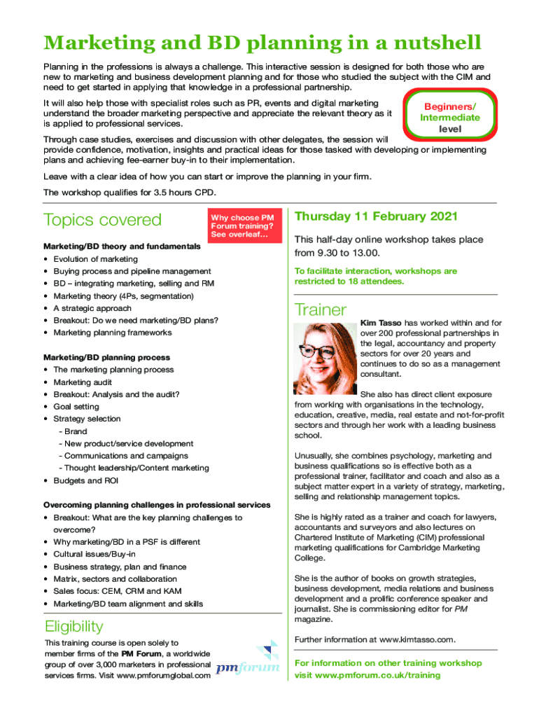 Marketing and BD planning in a nutshell Planning in the professions is always a challenge. This interactive session is designed for both those who are new to marketing and business development planning
