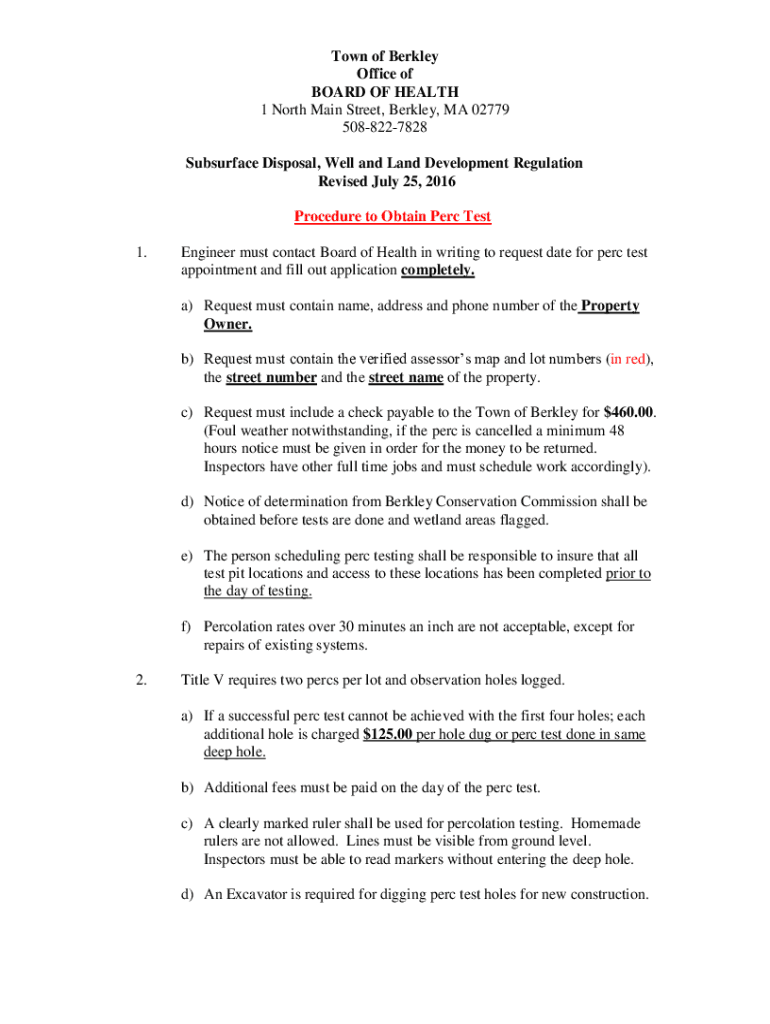 Town of Berkley Office of BOARD OF HEALTH 1 North Main Street, Berkley, MA 02779 5088227828 Subsurface Disposal, Well and Land Development Regulation Revised July 25, 2016, Procedure to Obtain Per