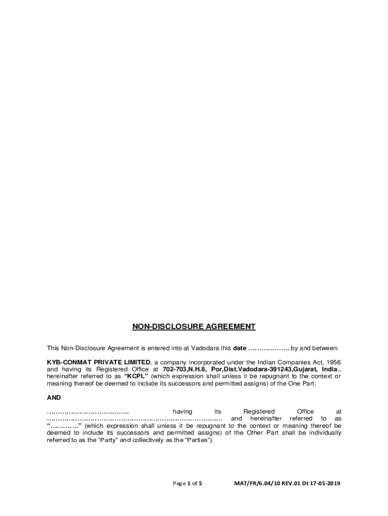 NONDISCLOSURE AGREEMENT This Nondisclosure Agreement is entered into at Vadodara this date. By and between: KYBCONMAT PRIVATE LIMITED, a company incorporated under the Indian Companies Act, 1956 and