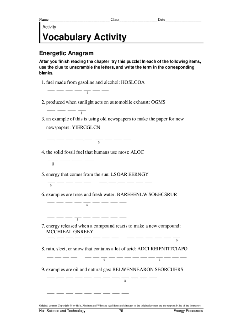 Name ___ Class ___ Date ___ActivityVocabulary Activity Energetic Anagram After you finish reading the chapter, try this puzzle! In each of the following items, use the clue to unscramble the letters,