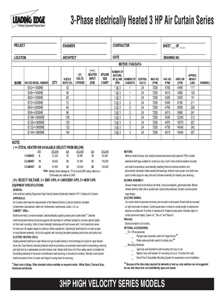 3Phase electrically Heated 3 HP Air Curtain Series___ PROJECT___ ENGINEER___ CONTRACTOR___ SHEET ___ OF ______ LOCATION___ ARCHITECT___ DATE___ DRAWING NO.MOTOR / FAN DATAMARKHEATED MODEL NUMBER.