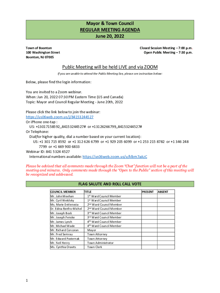 Mayor & Town Council REGULAR MEETING AGENDA June 20, 2022, Town of Boon ton 100 Washington Street Boon ton, NJ 07005Closed Session Meeting 7:00 p.m. Open Public Meeting 7:30 p.m. Public Meeting will