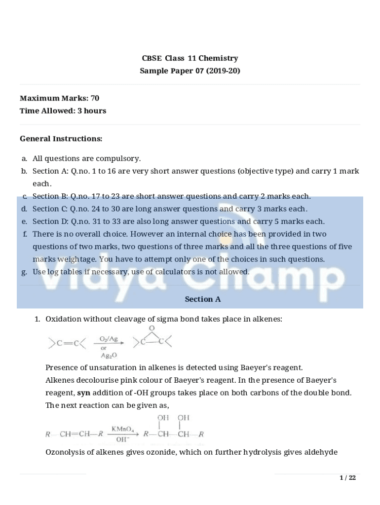 CBSE Class 11 Chemistry Sample Paper 07 (201920)Maximum Marks: 70 Time Allowed: 3 hoursGeneral Instructions: a. All questions are compulsory. b. Section A: Q.no. 1 to 16 are very short answer questions