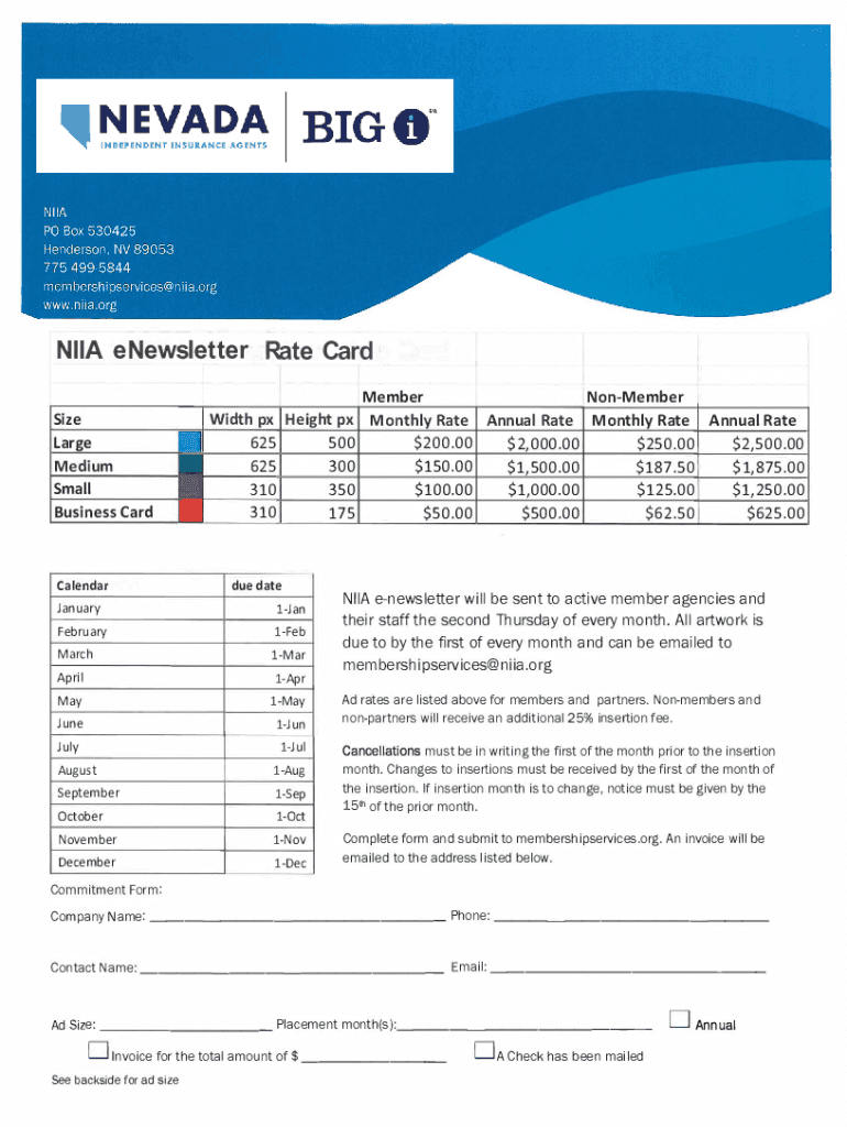 NINA newsletter Rate Card Size Large Medium Small Business CardCalendarMember Width PX Height PX Monthly Rate 625 625 310 310500 300 350 175due dateJanuary1JanFebruary1FebMarch1MarApril1AprMay1MayJune1JunJuly1JulAugust1AugSeptember1SepOctober10ctNovember1NovDecember1DecNonMember