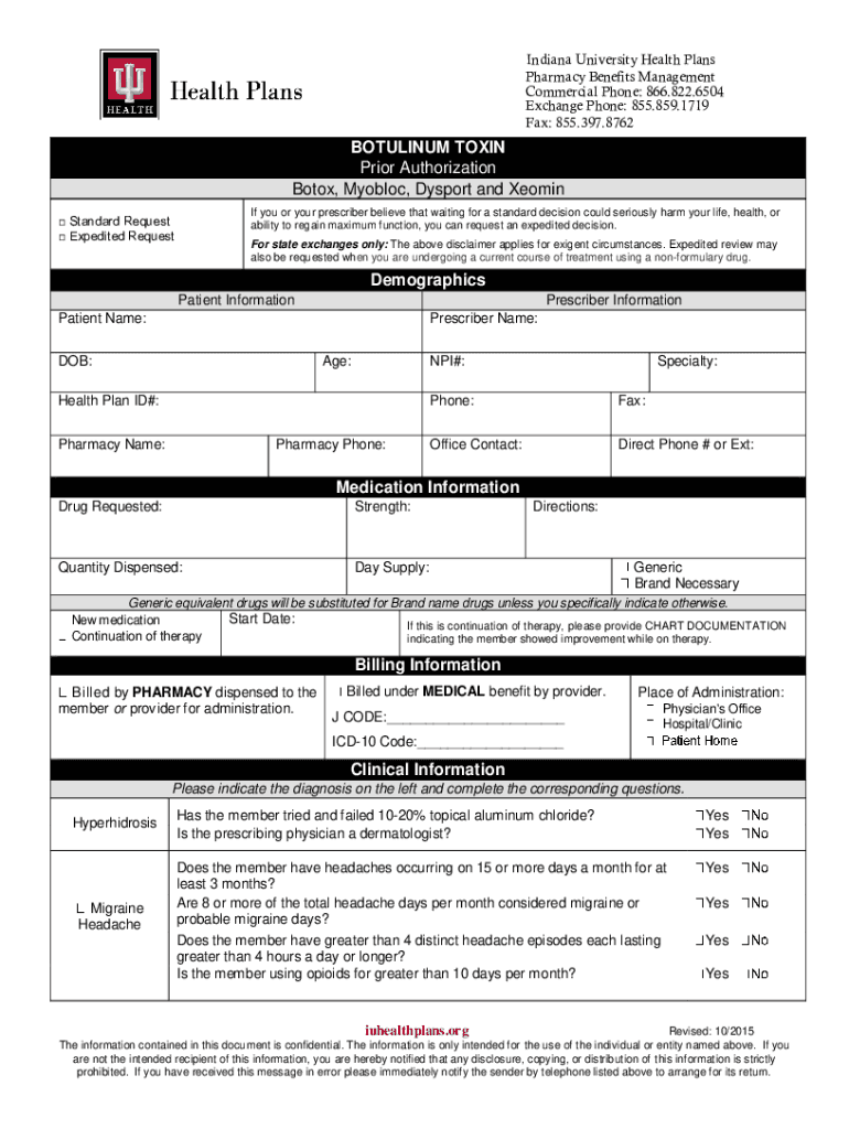 Indiana University Health Plans Pharmacy Benefits Management Commercial Phone: 866.822.6504 Exchange Phone: 855.859.1719 Fax: 855.397.8762BOTULINUM TOXIN Prior Authorization, and If you or your prescriber