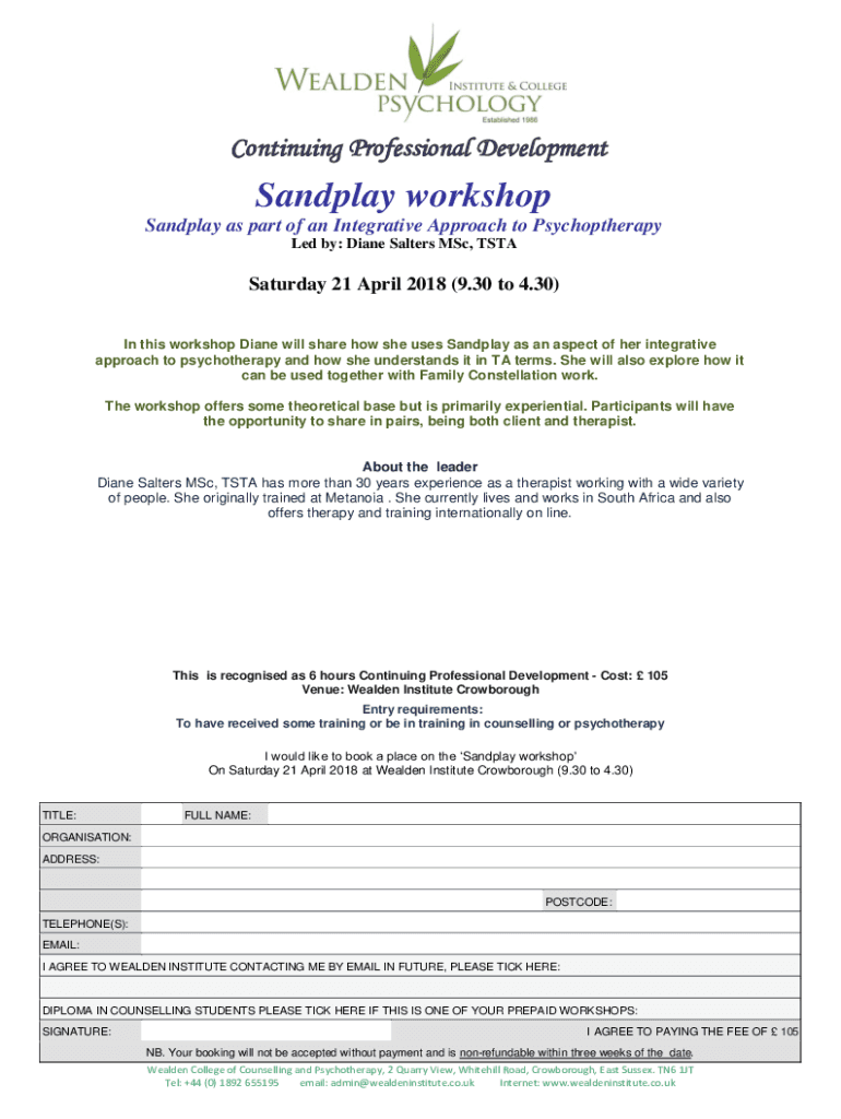 Continuing Professional DevelopmentSandplay workshop Sand play as part of an Integrative Approach to Psychotherapy Led by: Diane Salter's M.Sc., TSTASaturday 21 April 2018 (9.30 to 4.30) In this workshop