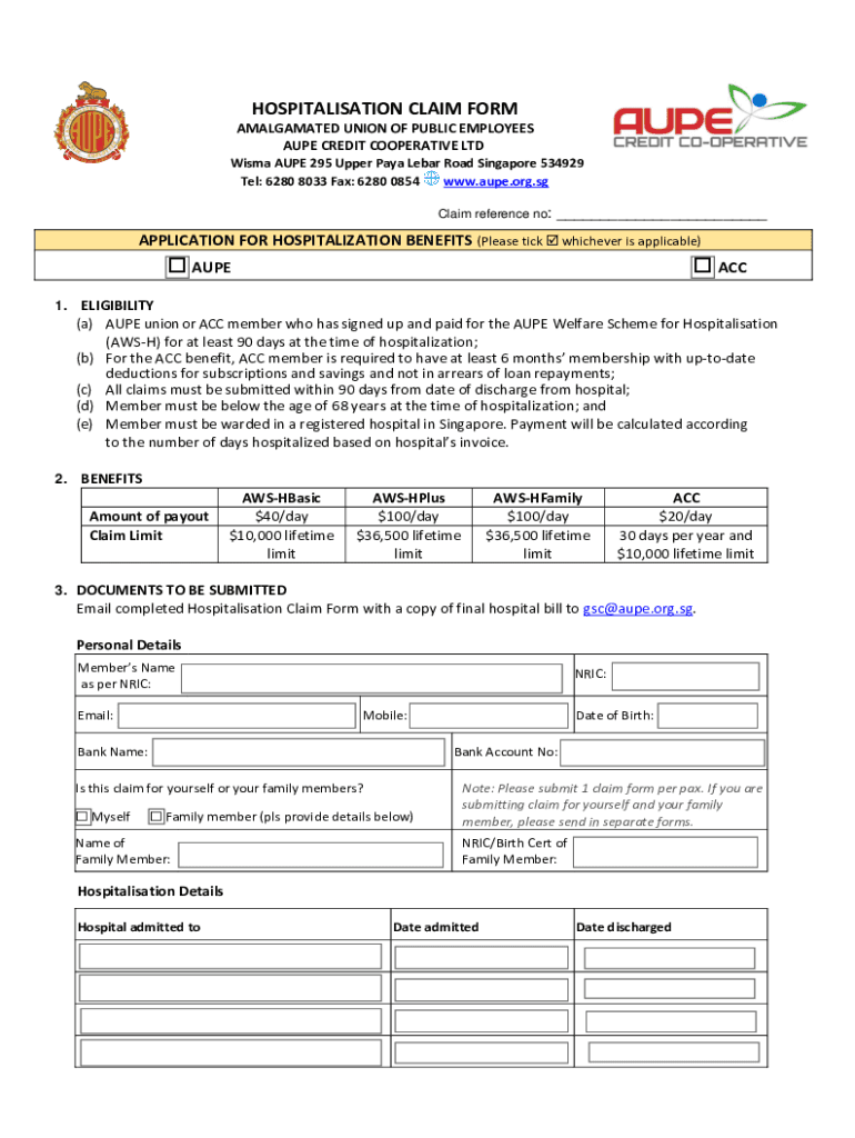 Get the free HOSPITALISATION BENEFIT CLAIM FORM - AUPE