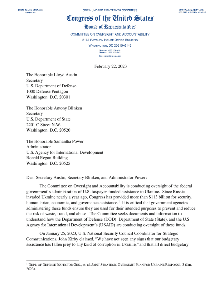 February 22, 2023, The Honorable Lloyd Austin Secretary U.S. Department of Defense 1000 Defense Pentagon Washington, D.C. 20301 The Honorable Antony Blinken Secretary U.S. Department of State 2201