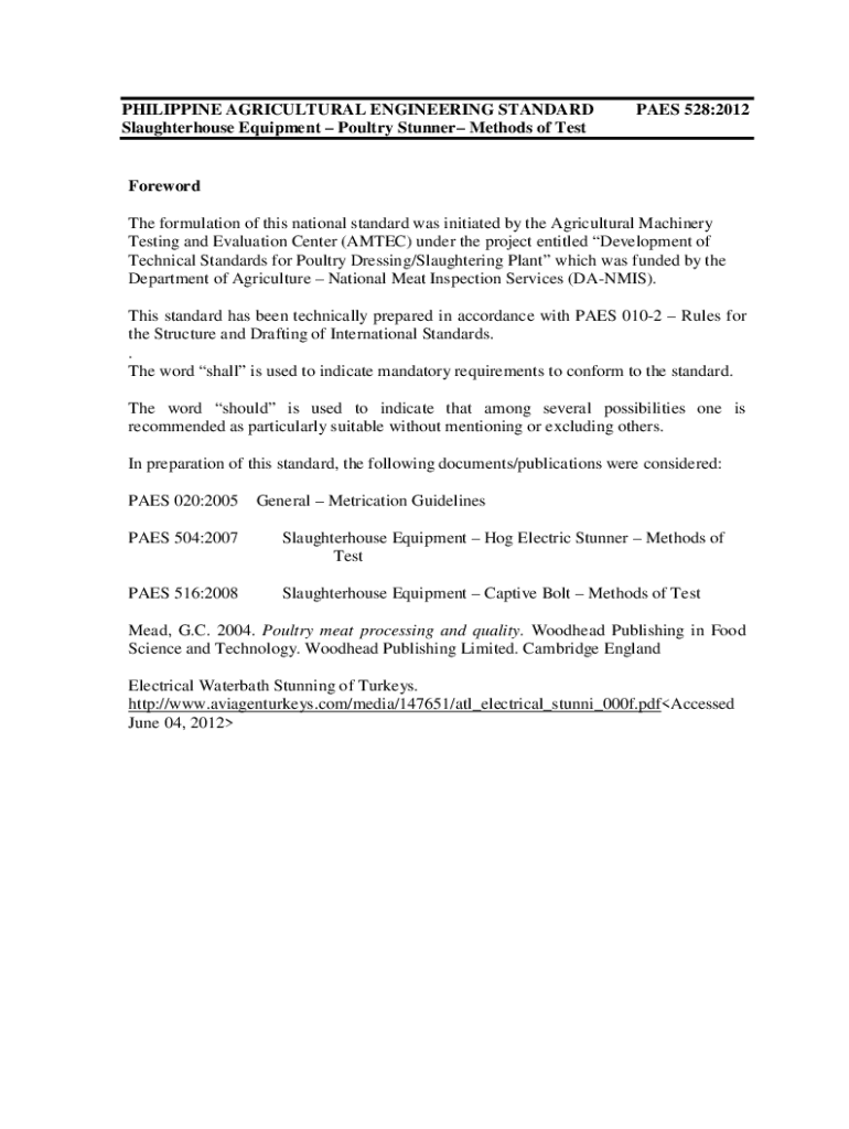 PHILIPPINE AGRICULTURAL ENGINEERING STANDARD Slaughterhouse Equipment Poultry Stunner Methods of Test PAES 528:2012Foreword The formulation of this national standard was initiated by the Agricultural