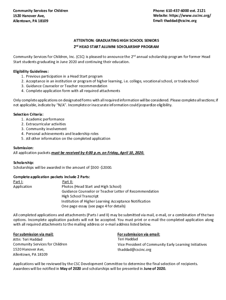 Phone: 6104376000 ext. 2121 Website: https://www.cscinc.org/ Email: thaddad@cscinc.orgCommunity Services for Children 1520 Hanover Ave, Allentown, PA 18109ATTENTION: GRADUATING from HIGH SCHOOL SENIORS
