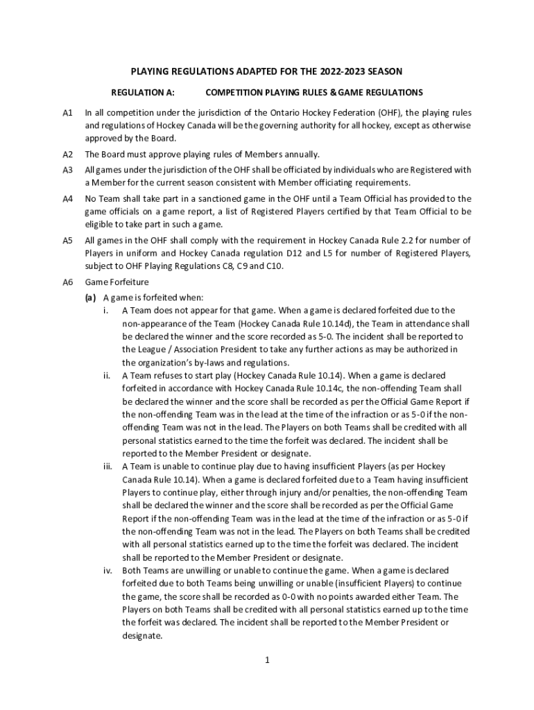 PLAYING REGULATIONS ADAPTED FOR THE 20222023 SEASON REGULATION A:COMPETITION PLAYING RULES & GAME REGULATIONSA1In all competition under the jurisdiction of the Ontario Hockey Federation (OF), the