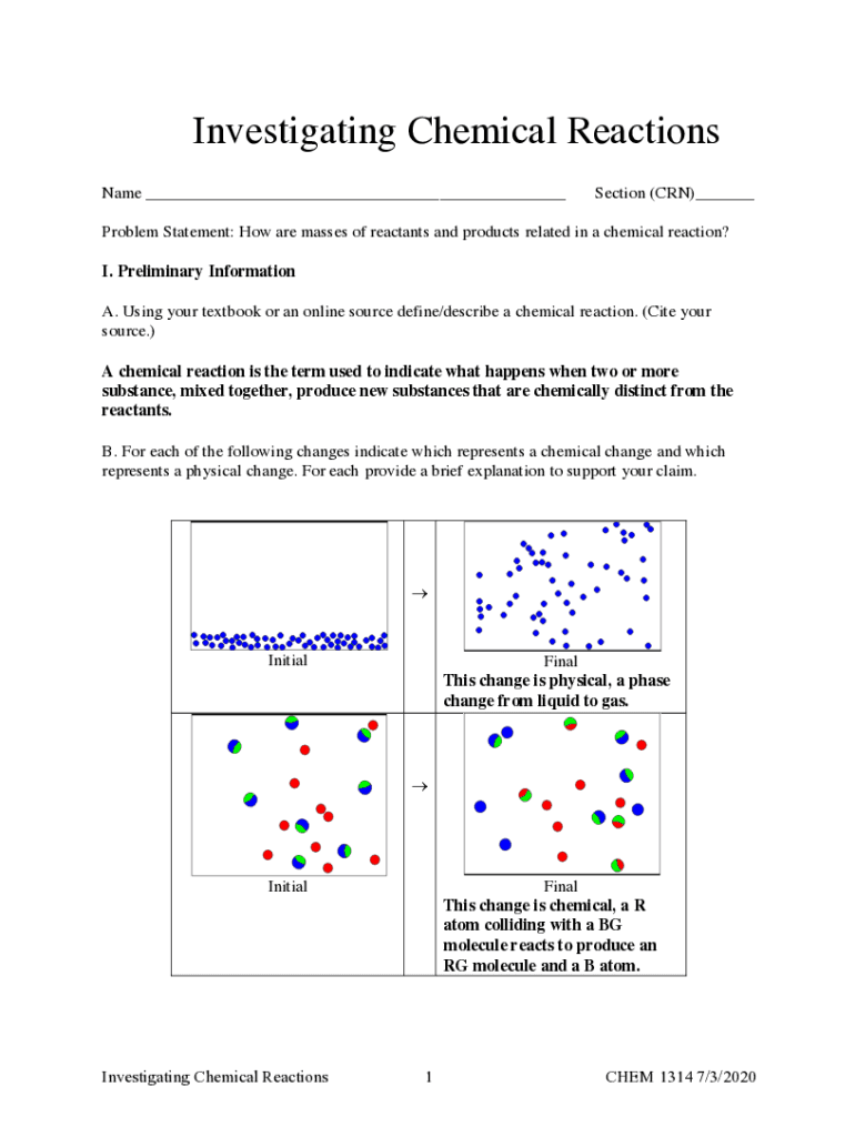 Investigating Chemical Reactions Name ___Section (CRN)___Problem Statement: How are masses of reactants and products related in a chemical reaction? I. Preliminary Information A. Using your textbook