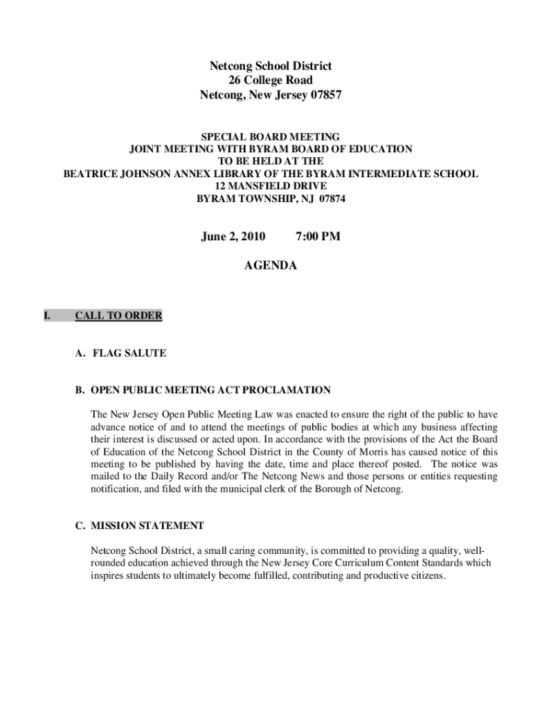Netting School District 26 College Road Netting, New Jersey 07857SPECIAL BOARD MEETING JOINT MEETING WITH BY RAM BOARD OF EDUCATION TO BE HELD AT THE BEATRICE JOHNSON ANNEX LIBRARY OF THE BY RAM INTERMEDIATE