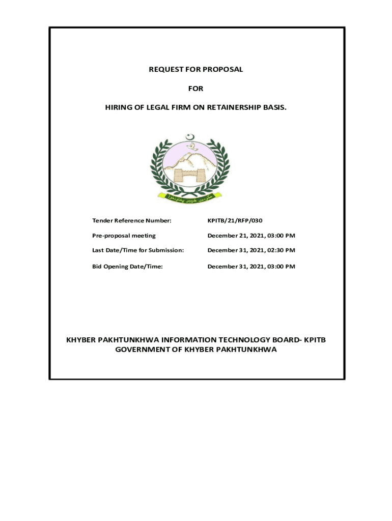 REQUEST FOR PROPOSAL FOR HIRING OF LEGAL FIRM ON RETAINERS HIP BASIS. Tender Reference Number:KP ITB/21/RFP/030Preproposal meeting December 21, 2021, 03:00 Last Date/Time for Submission:December 31,