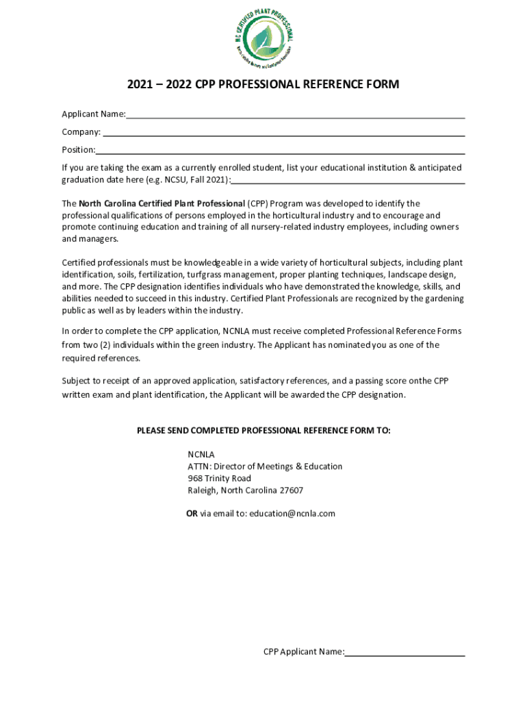 2021 2022 CPP PROFESSIONAL REFERENCE FORM Applicant Name: Company: Position: If you are taking the exam as a currently enrolled student, list your educational institution & anticipated graduation