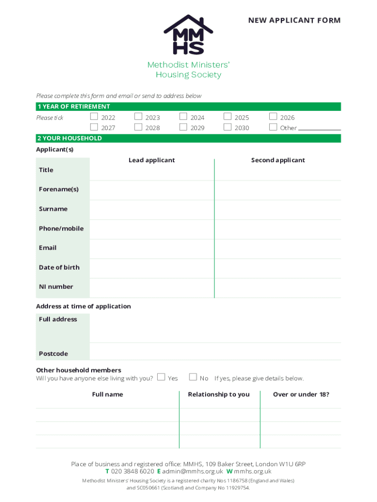 NEW APPLICANT FORM Methodist Ministers Housing Society Please complete this form and email or send to address below 1 YEAR OF RETIREMENT Please tick202220232024202520262027202820292030Other2 YOUR