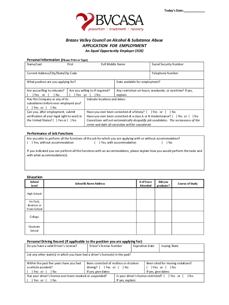 Today's Date:Brazos Valley Council on Alcohol & Substance Abuse APPLICATION FOR EMPLOYMENT An Equal Opportunity Employer (EOE)Personal Information (Please Print or Type) Name/LastFirstFull Middle