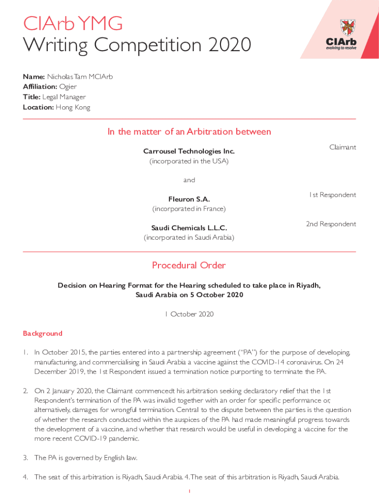 CIRB BMG Writing Competition 2020 Name: Nicholas Tam CIRB Affiliation: Gear Title: Legal Manager Location: Hong Kong In the matter of an Arbitration between ClaimantCarrousel Technologies Inc. (incorporated