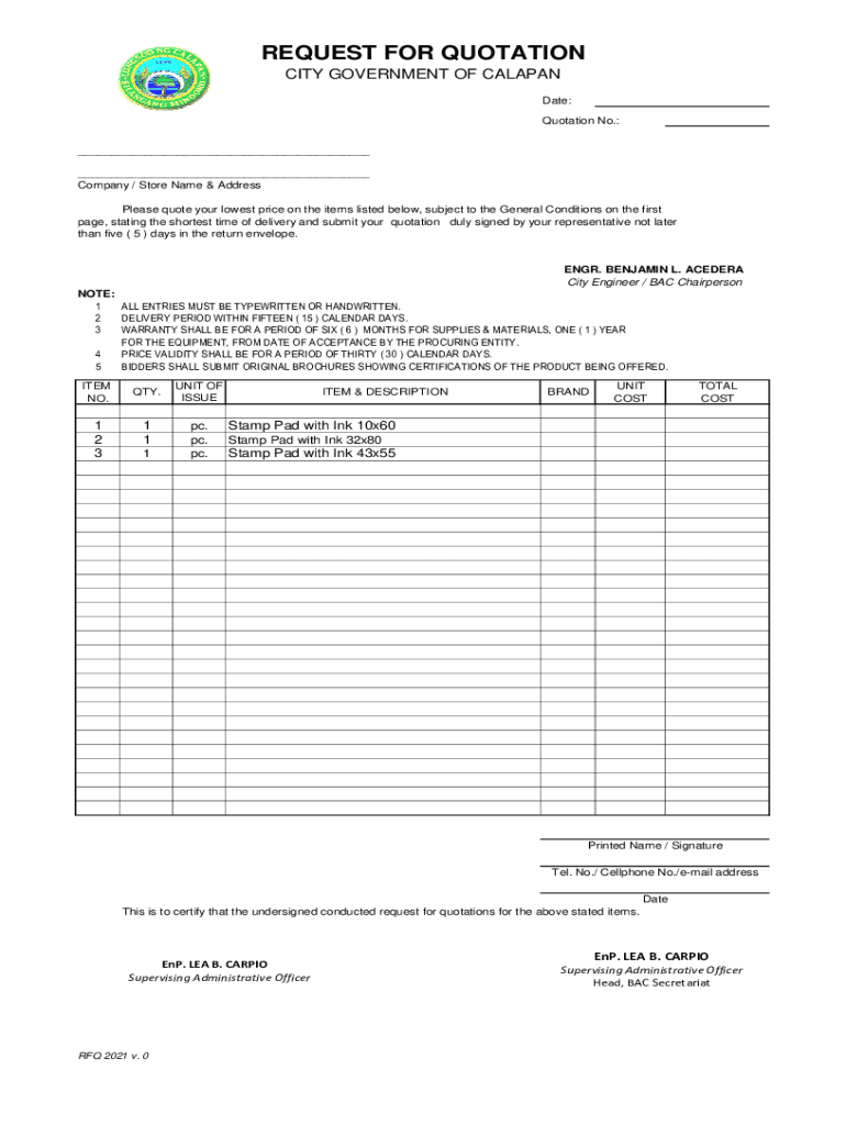REQUEST FOR QUOTATION CITY GOVERNMENT OF CATALAN Date: Quotation No.: ___ ___ Company / Store Name & Address Please quote your lowest price on the items listed below, subject to the General Conditions