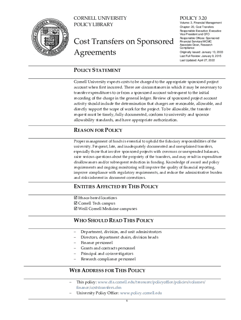 CORNELL UNIVERSITY POLICY LIBRARYPOLICY 3.20Cost Transfers on Sponsored AgreementsVolume: 3, Financial Management Chapter: 20, Cost Transfers Responsible Executive: Executive Vice President and CFO