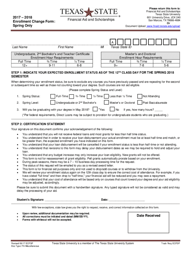 2017 2018 Enrollment Change Form: Spring OnlyPlease return this form to: Financial Aid and Scholarships Texas State University 601 University Drive, JACK 240 San Marcos, TX 786664684 Or Document Upload
