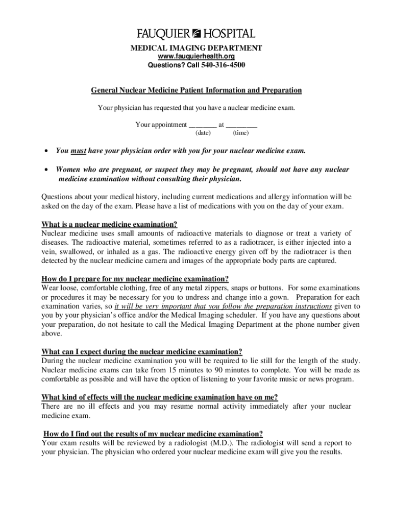 MEDICAL IMAGING DEPARTMENT www.fauquierhealth.org Questions? Call 5403164500General Nuclear Medicine Patient Information and Preparation Your physician has requested that you have a nuclear medicine