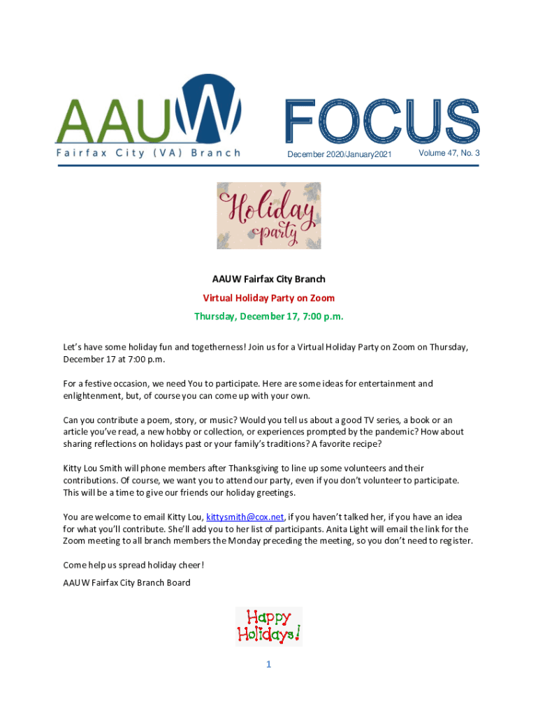FOCUS December 2020/January2021Volume 47, No. 3AAUW Fairfax City Branch Virtual Holiday Party on Zoom Thursday, December 17, 7:00 p.m. Let's have some holiday fun and togetherness! Join us for a Virtual