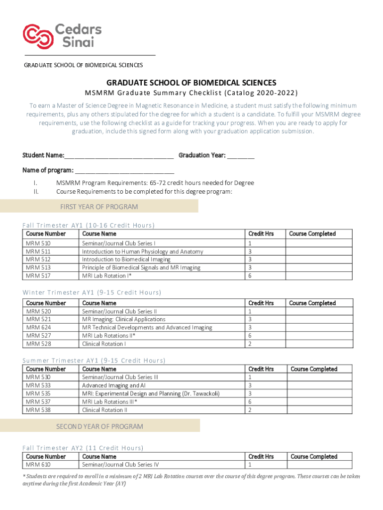 GRADUATE SCHOOL OF BIOMEDICAL SCIENCESGRADUATE SCHOOL OF BIOMEDICAL SCIENCES MSM RM Graduate Summary Checklist (Catalog 20202022) To earn a Master of Science Degree in Magnetic Resonance in Medicine,