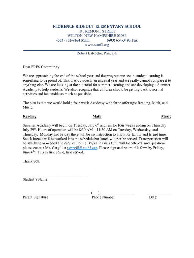 FLORENCE HIDEOUT ELEMENTARY SCHOOL18 TREMONT STREET WILTON, NEW HAMPSHIRE 03086 (603) 7329264 Main (603) 6543490 Fax www.sau63.org ___Robert La Roche, Principal Dear FREE Community, We are approaching