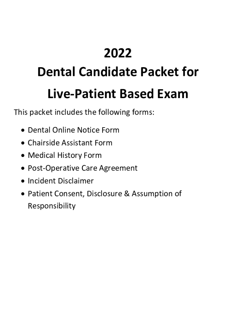 2022 Dental Candidate Packet for Impatient Based Exam This packet includes the following forms: Dental Online Notice Form Chair side Assistant Form Medical History Form PostOperative Care Agreement