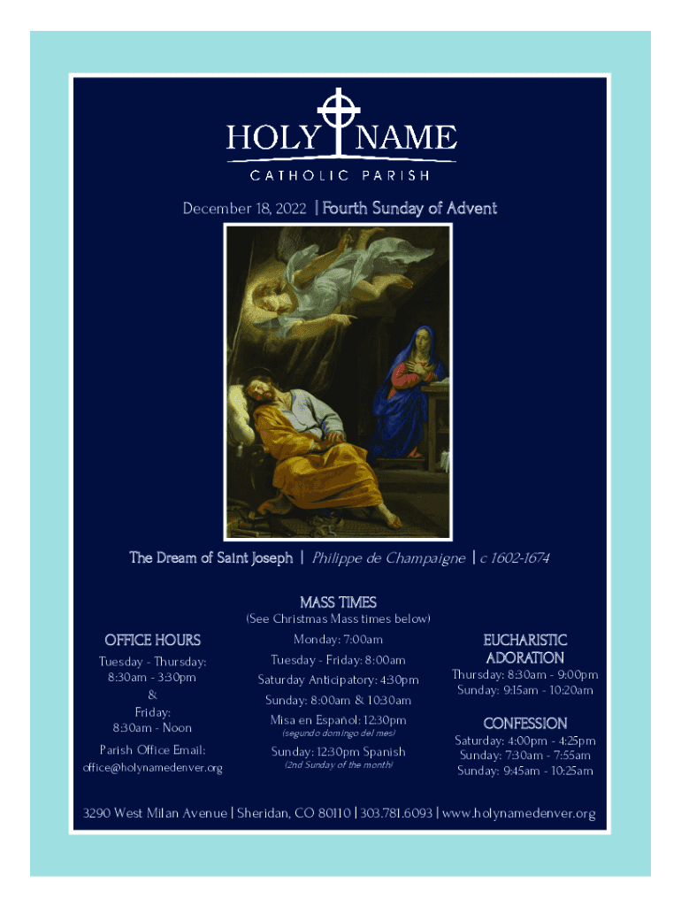 December 18, 2022 | Fourth Sunday of Adventure Dream of Saint Joseph | Philippe de Champaigne | c 16021674 MASS TIMES OFFICE HOURS Tuesday Thursday: 8:30am 3:30pm & Friday: 8:30am Noon Parish Office