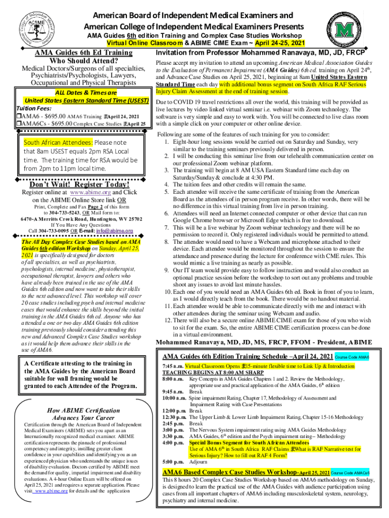 American Board of Independent Medical Examiners and American College of Independent Medical Examiners Presents AMA Guides 6th edition Training and Complex Case Studies Workshop Virtual Online Classroom