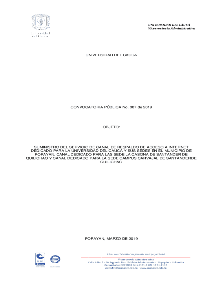 Vicerrectora AdministrativaUNIVERSIDAD DEL CAUCACONVOCATORIA PBL ICA No. 007 de 2019OBJETO:MINISTRY DEL SERVICE DE CANAL DE REINALDO DE ACCESS A INTERNET