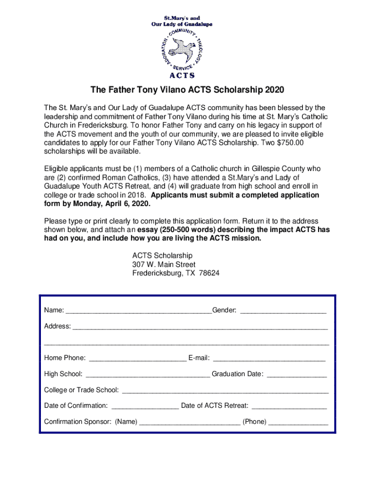 The Father Tony Vila no ACTS Scholarship 2020 The St. Mary's and Our Lady of Guadalupe ACTS community has been blessed by the leadership and commitment of Father Tony Vila now during his time at St.
